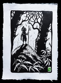 Handmade lino Cut Print of a pixie from the 'Scalva' tribe, wearing winter furs